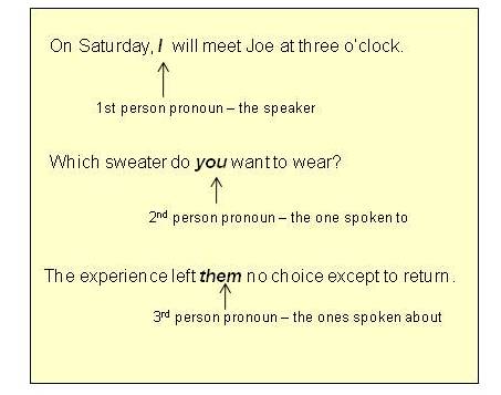 1st person - the one(s) speaking (I me my mine we us our ours)